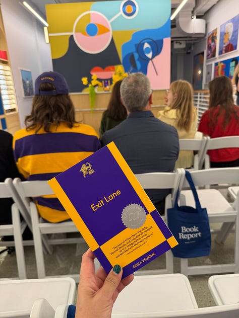It’s always, “I love reading!” and never “I love listening to an author talk about how she turned real-life events into top-tier fiction for this smutty little book.” Listen, the publishing industry is alive and well (I think?), and book events are happening all over the place if you know where to look. Loyal Floor Timers know that I won’t shut the hell up about 831 Stories. Well, I’m also on their mailing list, and in early September I got an email to attend a free launch event for their newest novella, Exit Lane by Erika Veurink (certified cool girl and author of the fashion Substack, Long Live). The event was hosted by Warby Parker as part of their new event series, Book Report (books + glasses collab… genius marketing), and included free books, 831 merch (the standout being the perfect book-sized tote), and freshly popped popcorn and wine. I loved listening to creative people talk about creative things, and it got me excited to find my sun spot this weekend to devour this book in a sitting.